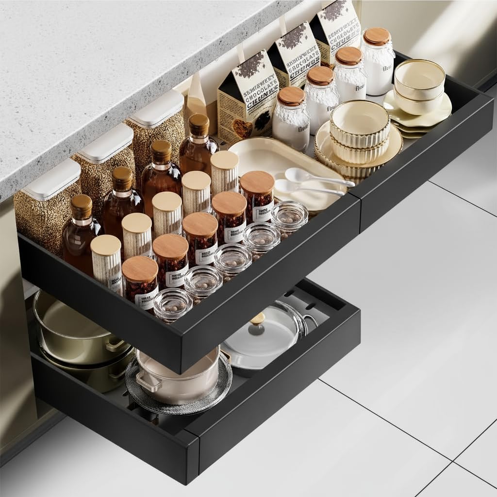 - Acceso Total y Mejora Visual: 👀 Olvídate de agacharte o vaciar todo el armario para encontrar el tupper del fondo. Con los cajones extraíbles de cocina, todo está al alcance de la mano. Además, su diseño minimalista y acabado en negro aporta un toque de elegancia y orden a cualquier espacio.